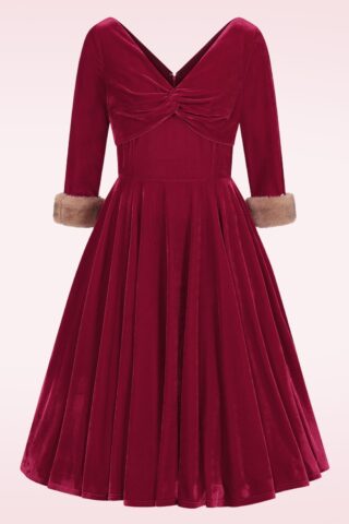 “All eyes on you, darling!” Deze prachtige fluwelen swingjurk is het toppunt van old-school glamour! Ze heeft een elegante V-halslijn met een verfijnd gedraaid detail bij de buste dat je silhouet prachtig accentueert. De afneembare imitatiebont biezen langs de mouwtjes zorgen voor die onweerstaanbare Hollywood touch — perfect voor feestelijke gelegenheden. Ze is uitgevoerd in een zachte, stretchy fluwelen stofmix in een rijke rode tint die heerlijk draagt én je laat stralen bij elke stap. * Swing jurk * V-halslijn met gedraaid detail * 1/2 mouwtjes met afneembare imitatiebont manchetten * Rits- en haaksluiting achterzijde * Reikt bij een lengte van 1,70 m over de knie