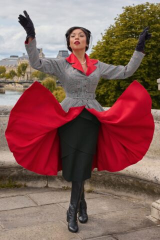 “Two looks in one timeless piece!” Dit prachtige herfstitem uit de nieuwe collectie is geïnspireerd op de extraordinaire Marie-Louise Carven, een baanbrekende Franse couturière uit de jaren ’40 en ’50. Ze is een vintage-geïnspireerde beauty die moeiteloos wisselt tussen een opvallend rood en een klassiek grijs ruitpatroon, met prachtige contrasterende biezen. Ze heeft een flatterende fit-and-flare pasvorm, dubbele knopen en een bijpassende ceintuur, waardoor deze manteljurk zowel elegant als praktisch is. En ja, ze heeft zakken aan beide zijden! Uitgevoerd in een stevige, maar soepel vallende stofmix met een vleugje viscose en een hele lichte stretch, waardoor ze heerlijk comfortabel draagt. * Reversible manteljurk * Revers kraag * Functionele knopenreeks voorzijde * Afneembare riem, voor een extra ‘snatched’ taille * Voorzien van zakken * Valt bij een lengte van 1,70 m over de knie