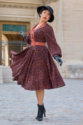 Meet Thais Amber! Dit prachtige exemplaar uit de nieuwe collectie is geïnspireerd op de extraordinaire Marie-Louise Carven, een baanbrekende Franse couturière uit de jaren ’40 en ’50. Ze heeft sierlijke bisschopsmouwen, een flatterende pasvorm met bijbehorende ceintuur en functionele knopen aan de voorkant, die een tijdloze vintage uitstraling geven. Praktische zakken in de zijnaad en een ritssluiting aan de achterkant maken deze beauty net zo functioneel als verfijnd. Ze is uitgevoerd in een stevige, maar soepele linnen/viscosemix in marineblauw, met een bloemenprint in rijk baksteenrood. * Swing jurk  * Revers kraag * Lange bisschopsmouwen met manchetten * Functionele knopenreeks voorzijde  * Verborgen ritssluiting achterzijde  * Peplum detail  * Afneembare riem, voor een extra ‘snatched’ taille * Voorzien van zakken * Valt bij een lengte van 1,70 m over de knie