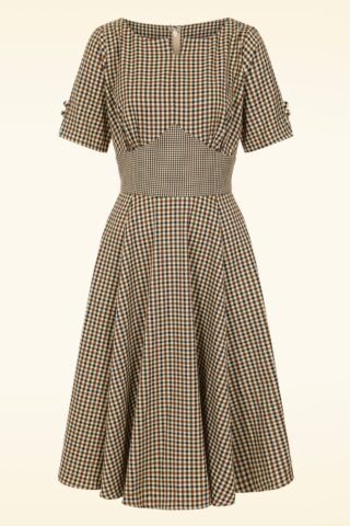 “Classic checks, endless charm!” Deze prachtige swing jurk straalt klassieke charme uit met haar geruite print in warme beige- en bruintinten. De flatterende brede tailleband accentueert je silhouet op elegante wijze, terwijl de zwierige rok en handige zakken zorgen voor een speelse, vrouwelijke look. Uitgevoerd in een stevige maar soepele stofmix met een optimaal draagcomfort. * Swing model * Korte mouwtjes met decoratieve knoopjes * Brede tailleband * Zijwaartse steekzakken * Rits- en haaksluiting achterzijde * Valt bij een lengte van 1,70 m over de knie