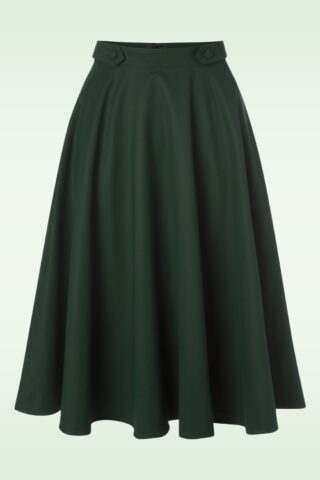 ”Swing your way into winter” met deze 50s Di Di Swing Skirt in Forest Green! Dit fifties pareltje draag je hoog in de taille, vanwaar zij uitloopt in een klassieke, elegante swing rok. De ‘faux’ knoopdetails in de zij vormen niet alleen een speels detail, maar benadrukken je taille ook nog eens extra. Uitgevoerd in een stevige maar soepel vallende, donkergroene stof (stretcht amper) die prachtig met je mee beweegt. De winterperiode kan zo mooi zijn, zeker met een rok als Di Di in je kast 😉 * Full swing rok * ‘Faux’ knoopdetails * Zijwaartse steekzakken * Rits- en haaksluiting achterzijde * Combineer met een van onze petticoats voor een extra feestelijk effect * Valt bij een lengte van 1,70 m over de knie