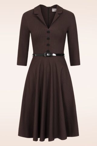 ”Effortlessly chic, effortlessly me!” Deze classy semi swing beauty heeft een elegante v-halslijn met revers kraag, decoratieve knoopjes aan de voorzijde en is voorzien van handige steekzakken. Ze is uitgevoerd in een stevige maar stretchy bengaline achtige donkerbruine stof voorzien van een witte krijtstreep, die heerlijk comfortabel draagt. * Swing model * V-halslijn met revers kraagje * Sierknopen aan de voorzijde * 3/4 mouwen * Afneembaar lakriempje, voor een extra ‘snatched’ taille * Voorzien van zakken! * Blinde rits achterzijde * Valt bij een lengte van 1,70 m net over de knie * Exclusief bij Topvintage verkrijgbaar