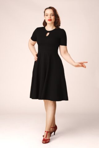 Waan je een classy celebrity Diva in deze onweerstaanbaar swing dress! Dit seizoen hebben onze eigen in-house ontwerpers zich laten inspireren door de iconische stijl van Ava Gardner in de film ‘Barefoot Contessa’. Classy, super vrouwelijk en een tikkeltje sassy. Uitgevoerd in een stevige maar stretchy, high quality, zwarte viscosemix die een genot is om te dragen en gracieus met je meebeweegt. Hollywood of Holland? Het maakt niets uit… jij bent de hoofdrolspeelster zodra je deze stunner aantrekt! * Swing model * Gevoerde top * Diamantvormige halslijn * 3/4 pofmouwtjes met omslagjes * Afneembare roos corsage * Blinde rits achterzijde * Elisabeth (Barinovael) is 1,67 m: haar pumps en accessoires zijn haar eigen treasures