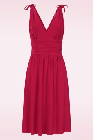 “The Grecian dress in red: fluid, effortless, impossible to ignore.” De top heeft zowel aan de voor- als achterzijde een diepe V met mooie overslag, waardoor je een sexy decolleté laat zien, oh la la! De licht geplooide cups lopen door in brede schouderbandjes met een speels strikdetail op de schouder. Uitgevoerd in een glad, soepel en stretchy slinky dieprood stofje, dat heerlijk comfortabel draagt.   * Zwierig model * Gevoerde top * Vaste overslag * Vaste strikbandjes * Flaterende geplooide tailleband * Geen rits of knopen; aantrekken en ready to go! * Valt bij een lengte van 1,70 m over de knie * Exclusief bij Topvintage verkrijgbaar