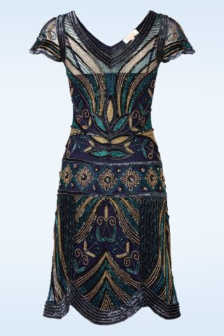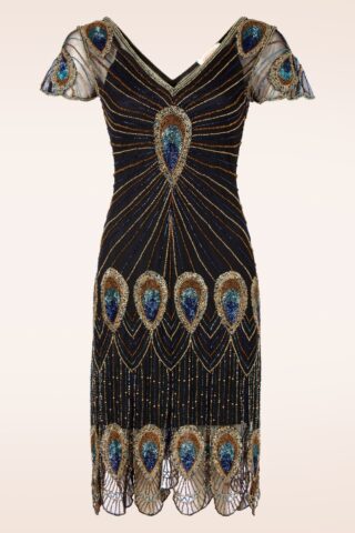 “Roaring ’20s vibes, modern sparkle… flapper fabulous in every step.” Deze hand bewerkte, party-proof jurk is een reproductie van de elegante flapper dresses uit de jaren 20! Uitgevoerd in een zwarte, semi-doorschijnende stof met een donkerblauwe onderjurk, voorzien van een hele lichte stretch. Afgewerkt met glimmende kraaltjes in blauw en goudtinten. “Dazzle, sparkle, repeat!” * Aansluitend model * Handbewerkt * Onderjurkje * V-hals en rug * Geschulpte kapmouwtjes * Geen rits of knopen; aantrekken en ready to party! * Valt bij een lengte van 1,70 m net over de knie