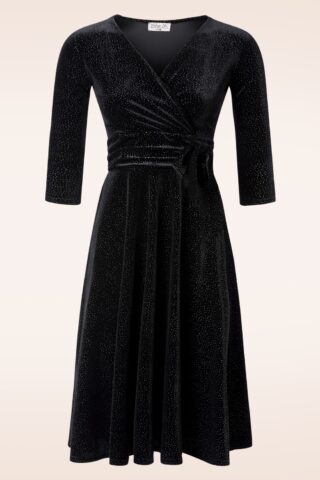 ”Sparkle with confidence!” Aria is uitgevoerd in een soepele, zachte en stretchy zwarte stof met met de luxe look and feel van fluweel en is bovendien bezaaid met zilverkleurige glitters. Helemaal party proof met Aria! * Semi-swing model * V-halslijn * Vaste gevoerde overslag * 3/4 mouwen * Geplooide tailleband met vaste strik * Geen rits of knopen; aantrekken en ready to go! * Valt over de knie bij een lengte van 1,70 m * Exclusief bij Topvintage verkrijgbaar