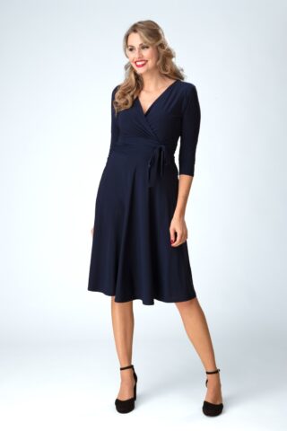 Voel je op en top vrouw in deze Aria swing jurk! Ze is uitgevoerd in een soepele en stretchy, licht glanzende, slinky stof in marineblauw en is tevens licht van gewicht en kreukt niet. * Semi-swing model * V-halslijn * Vaste gevoerde overslag * 3/4 mouwen * Geplooide tailleband met vaste strik * Geen rits of knopen; aantrekken en ready to go! * Valt over de knie bij een lengte van 1,70 m * Melissa is 1,78 m * Exclusief bij Topvintage verkrijgbaar * Let op; de kleur van het product op video kan afwijken van de daadwerkelijke kleur van het product
