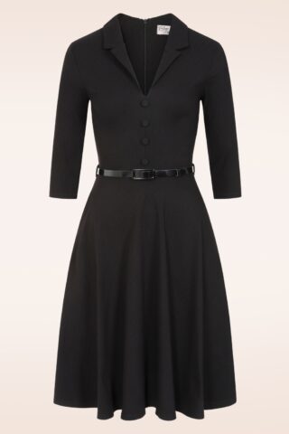 “Flirty swing, rich texture… black has never felt so alive.” Deze classy semi swing beauty is uitgevoerd in een stevige maar stretchy begaline achtige textuurstof die heerlijk draagt. * Swing model * Puntig kraagje * Sierknopen * 3/4 mouwen * Afneembaar lakriempje, voor een extra ‘snatched’ taille * Met zakken! * Blinde rits achterzijde * Valt bij een lengte van 1,70 m net over de knie * Exclusief bij Topvintage verkrijgbaar