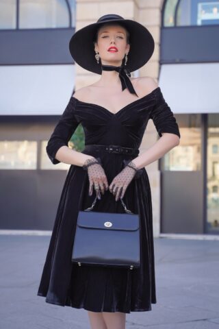 ”Dance into the night dressed like a daydream!”. De inspiratie van onze in-house designers dit seizoen was ”Transcending Classic Glamour”. En eerlijk is eerlijk: Al onze verwachtingen zijn alweer overtroffen met deze collectie! Deze stunner is uitgevoerd in een zachte, stretchy, zwarte fluwelen stof voor een ‘picture perfect’ fit! ”I’m very definitely a woman and i enjoy it!” * Vol swing model: kan gecombineerd worden met een van onze petticoats * Gedrapeerde plooitjes bij de buste * 1/2 mouwtjes die off-shoulder gedragen kunnen worden * Corrigerende bengaline shapewear * Afneembaar riempje * Geheel gevoerd * Blinde rits aan de zijkant * Valt bij een lengte van 1,70 m over de knie