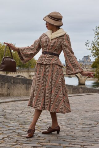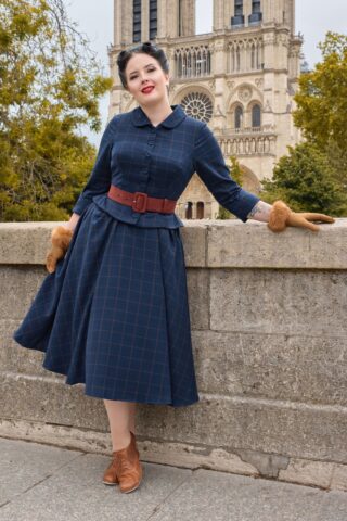 “A tribute to timeless femininity; where soft tailoring meets the romance of Parisian winters.” Deze Lylou swing jurk uit de nieuwe collectie is geïnspireerd op de extraordinaire Marie-Louise Carven; Een baanbrekende Franse couturière uit de jaren 40 en 50! Ze is uitgevoerd in een stevige, maar soepel vallende grijze stof met een zwart tartan ruitje (stretcht amper) dat heerlijk draagt. * Swing model * Kraagje * 3/4 pofmouwen met manchetten * Flatterende plooitjes bij de buste * Functionele knopenreeks met verborgen drukknoopje * Afneembare riem, voor een extra ‘snatched’ taille * Voorzien van zakken! * Valt bij een lengte van 1,70 m over de knie