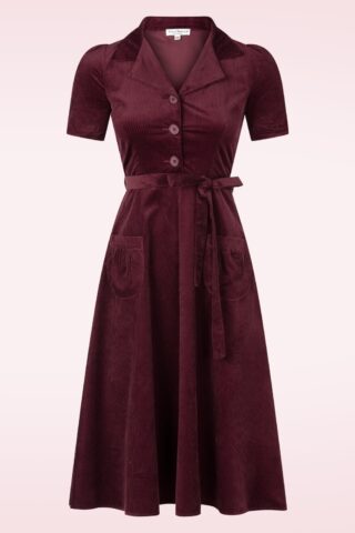 Voeg wat ‘fourties flair’ toe aan je garderobe! Ze heeft een V-halslijn met een speels reverskraagje, korte pofmouwen en een reeks grote knopen. Het striklint accentueert je taille voor een supervrouwelijk silhouet. Uitgevoerd in stevig maar soepel en zacht ribfluwelen katoen (stretcht niet) in granaatappelrood, dat heerlijk draagt. Slaat jouw vintagehartje ook al op hol? 😉 * Semi-swing model * V-halslijn * Revers kraagje * Korte pofmouwen * Reeks knopen voorzijde * Afneembaar striklint * Zakken voorzijde * Blinde rits zijkant * Valt bij een lengte van 1,70 m over de knie