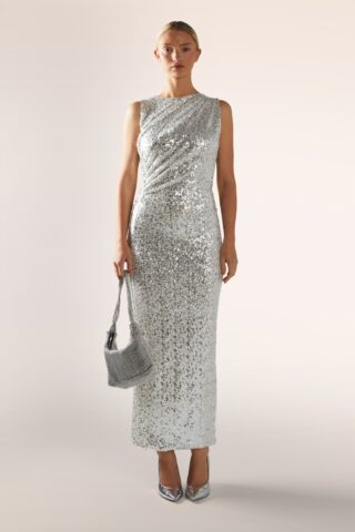 “Shimmer like the stars, shine like you mean it.” Laat je stralen in deze prachtige lange zilveren jurk! Ze heeft een flatterende pasvorm met subtiele plooitjes in de taille die je silhouet prachtig accentueren, en is volledig bezaaid met fonkelende zilveren glitters die het licht op magische wijze vangen. Uitgevoerd in een soepelvallend materiaal met een lichte stretch voor optimaal draagcomfort, terwijl de glitterdetails zorgen voor een glamoureuze, feestelijke uitstraling. Perfect voor een gala, bruiloft of elk moment waarop je wilt schitteren als een ster. * Maxi jurk * Geheel gevoerd * Mouwloos * Flatterende plooien in de taille * Blinde rits achterzijde * Split zijkant * Reikt tot op de enkel bij een lengte van 1,70 m