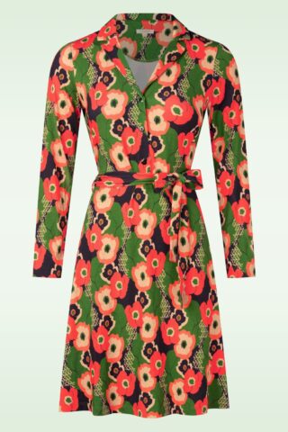 ”Retro blooms, timeless grooves!” Deze jurk is een echte eyecatcher dankzij haar kleurrijke retro bloemenprint in o.a. groen en oranje. Ze heeft een elegante reverskraag, lange mouwen en een speelse A-lijn die vanaf de taille prachtig uitwaaiert. Uitgevoerd in een heerlijk soepele en stretchy EcoVero viscosemix, die niet alleen comfortabel draagt maar ook een duurzame keuze is. * A-lijn * Revers kraag * Knoopjes voorzijde * Afneembaar striklint * Valt bij een lengte van 1,70 m net over de knie