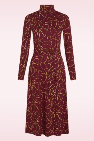 “Turn heads in turtlenecks!” Deze retro beauty heeft een col, lange mouwen en loopt vanaf de taille uit in een midi lengte semi-swing rok met vaste strikbanden in de taille. Ze is uitgevoerd in een soepele en stretchy EcoVero viscosemix met een grafische retro print in typische seventies kleuren. * Midi jurk met col * Vaste strikbanden in de taille * Reikt bij een lengte van 1,70 m tot op de kuit