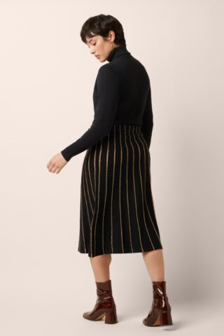 “Subtle shimmer, endless elegance!” Deze zwarte gebreide A-lijn rok ademt tijdloze klasse met een vleugje seventies glamour. Het streeppatroon met ingewerkte gouden glitterdraad laat haar subtiel schitteren bij elke stap. Gemaakt van een zachte, fijngebreide katoenmix met een vleugje kasjmier die luxueus aanvoelt op de huid en soepel met je meebeweegt. * A-lijn * Elastische tailleband * Geen rits of knopen; aantrekken en ‘ready to go’! * Valt bij een lengte van 1,70 m over de knie