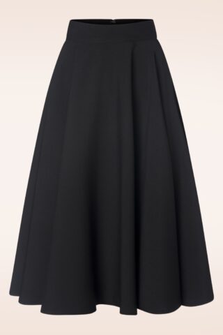 ”Swing your way into winter” met deze 50s Di Di Swing Skirt in Black! Dit fifties pareltje draag je hoog in de taille, vanwaar zij uitloopt in een klassieke, elegante swing rok. De ‘faux’ knoopdetails in de zij vormen niet alleen een speels detail, maar benadrukken je taille ook nog eens extra. Uitgevoerd in een stevige maar soepel vallende, zwarte stof (stretcht amper) die prachtig met je mee beweegt. De winterperiode kan zo mooi zijn, zeker met een rok als Di Di in je kast! 😉 * Full swing rok * ‘Faux’ knoopdetails * Zijwaartse steekzakken * Rits- en haaksluiting achterzijde * Combineer met een van onze petticoats voor een extra feestelijk effect * Valt bij een lengte van 1,70 m over de knie * Julia Fiore is 1,70 m