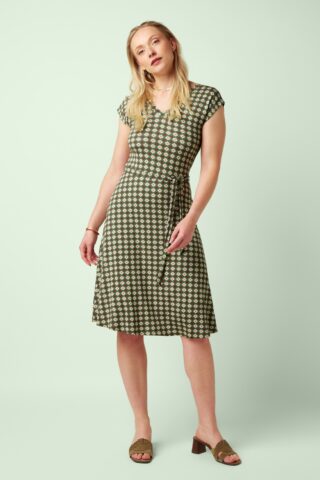 “Retro charm in every stitch.” Adele heeft een V-halslijn en een V-rug, met een afneembaar striklint dat je taille prachtig benadrukt. Ze is uitgevoerd in een heerlijk soepele en stretchy EcoVero-viscosemix die zacht aanvoelt en bovendien een duurzamere keuze is. * A-lijn * Korte kapmouwtjes * V-hals en rug * Afneembaar striklint voor een extra ‘snatched’ taille * Geen rits of knopen; aantrekken en ready to go! * Valt bij een lengte van 1,70 m tot net boven de knie