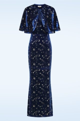 “Enchanted celestial elegance, from head to hem.” Deze opvallende maxi jurk heeft een afneembare cape die je schouders bedekt en is perfect voor het feestelijke seizoen! Ze heeft verstelbare spaghetti bandjes en loopt vanaf de taille over in een aansluitende maxi jurk. Uitgevoerd in een middernachtblauwe, glanzende en stretchy stof met de luxe look and feel van fluweel, voorzien van goudkleurige glitter sterren en maantjes. * Maxi jurk * Afneembare cape * V-hals * Gevoerde top * Verstelbare spaghettibandjes * Rits- en haaksluiting achterzijde * Reikt bij een lengte van 1,70 m tot aan de enkel