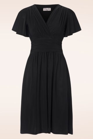 Een echte vintage beauty en perfect voor elke gelegenheid! Uitgevoerd in een glad en soepel, stretchy, zwart slinky stofje dat heerlijk draagt en niet kreukt. Geniet van de complimentjes die je krijgt, zodra je Sadie draagt! * Semi-swing stijl * Gevoerde top * Vaste overslag * Korte vlindermouwen * Geplooide tailleband * Geen rits of knopen; aantrekken en ready to go! * Valt bij een lengte van 1,70 m over de knie