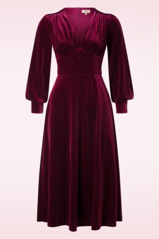 ”Velvet dream dress!” Vanity heeft lange pofmouwen met manchetten, plooitjes bij de buste, sierknoopjes en loopt vanaf de taille uit in een flowy midi rok. Ze is uitgevoerd in een ietwat dikkere, maar soepele bordeauxrode stof met de look and feel van luxe fluweel en een fijne stretch, die heerlijk draagt.  * Midi jurk * Plooitjes bij de buste * Sierknoopjes * Lange pofmouwen met manchetten * Met zakken! * Blinde rits achterzijde * Geheel gevoerd op de mouwen na * Reikt bij een lengte van 1,70 m tot halverwege de kuit