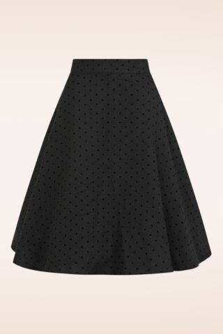 “Monochrome magic, dotted in velvet.” Deze swing beauty is voorzien van zwarte, fluwelen polkadotjes en is uitgevoerd in een stevige maar soepele, geweven structuur stof in zwart.  * Swing rok * It has pockets! * Rits met haaksluiting achterzijde * Valt bij een lengte van 1,70 m over de knie