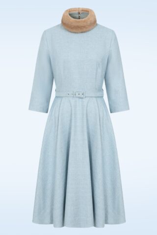 “Winter wonder in icy blue!” Voeg een vleugje elegante charme toe aan je garderobe met deze lichtblauwe swing jurk. Ze heeft een hoge halslijn, flatterende 3/4 mouwen en een zwierige swing rok die je silhouet prachtig laat uitkomen. Het afneembare imitatiebont kraagje geeft je look een cozy, luxe touch, terwijl de zachte en soepel vallende stofmix met een vleugje viscose en een lichte stretch zorgt voor optimaal draagcomfort. * Swing model * Hoge halslijn * Afneembaar bontkraagje * 3/4 mouwen * Zijwaartse steekzakken * Afneembare riem * Rits- en knoopsluiting achterzijde * Valt bij een lengte van 1,70 m over de knie