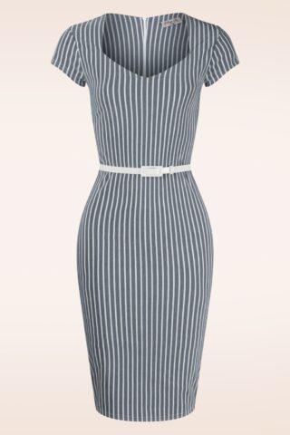 ”Simply chic!” Loreen is een elegant hoog taille model dat onmisbaar is in de kledingkast van iedere vrouw! Deze rok is gemaakt van een flatterende en stretchy, bengaline achtige viscosemix met een streepjesprint in denim grijsblauw en wit. Ze benadrukt je rondingen perfect, zonder af te tekenen. * Hoog taille model * Blinde rits achterzijde * Splitje aan de achterzijde * Valt over de knie bij een lengte van 1,70 m * Exclusief bij Topvintage verkrijgbaar