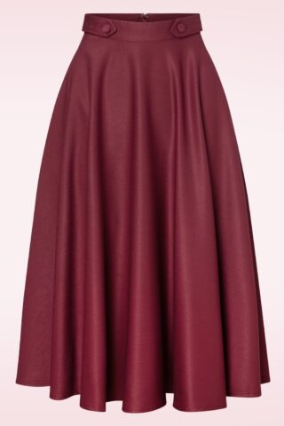 ”Swing your way into winter” met deze 50s Di Di Swing Skirt in Burgundy! Dit fifties pareltje draag je hoog in de taille, vanwaar zij uitloopt in een klassieke, elegante swing rok. De ‘faux’ knoopdetails in de zij vormen niet alleen een speels detail, maar benadrukken je taille ook nog eens extra. Uitgevoerd in een stevige maar soepel vallende, bordeauxrode stof (stretcht amper) die prachtig met je mee beweegt. De winterperiode kan zo mooi zijn, zeker met een rok als Di Di in je kast! 😉   * Full swing rok * ‘Faux’ knoopdetails * Zijwaartse steekzakken * Rits- en haaksluiting achterzijde * Combineer met een van onze petticoats voor een extra feestelijk effect * Valt bij een lengte van 1,70 m over de knie