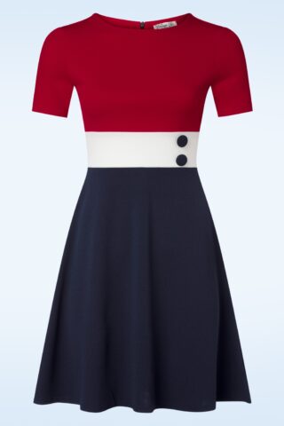 ”Life is short.. buy the dress!” Deze vintage geïnspireerde beauty heeft een hoge ronde halslijn, korte mouwtjes, decoratieve knoopjes aan de voorzijde en loopt vanaf de taille uit in een semi-swing rok. Ze is uitgevoerd in een stevige maar soepele en stretchy, crêpe achtige stof in de kleuren rood, wit en blauw, die heerlijk comfortabel draagt. * Semi-swing model * Ronde halslijn * Korte mouwen * Decoratieve knopen voorzijde * Blinde rits achterzijde * Exclusief bij Topvintage verkrijgbaar * Reikt bij een lengte van 1,70 m net boven de knie