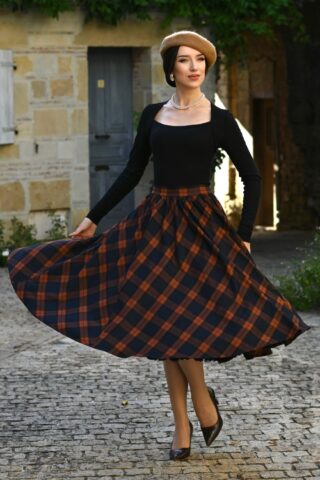 “Rich checks, timeless swing.” Tira wordt hoog in de taille gedragen vanwaar ze uitloopt in een zwierige full swing rok met handige zijwaartse steekzakjes. Uitgevoerd in een stevige maar zachte stof (stretcht amper) met een klassieke ruit in donkerblauw en roestbruin. * Swing stijl * Zijwaartse steekzakken * Blinde rits zijkant * Kan gecombineerd worden met een van onze petticoats * Valt bij een lengte van 1,70 m over de knie