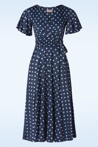• Topvintage exclusive ~ Irene polkadot overslag swing jurk in marineblauw