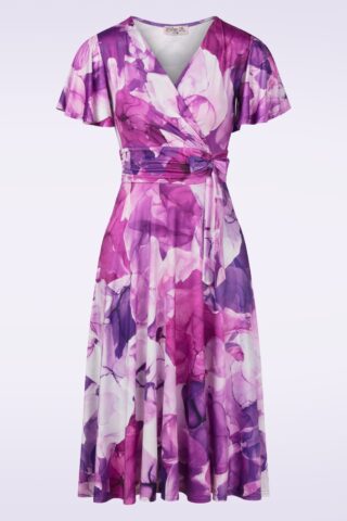 Hoe mooi is deze Irene jurk?! Ze heeft een vaste overslag top, korte vlindermouwtjes, een geplooide tailleband die ontzettend flatterend werkt en is uitgevoerd in een glad en soepel, licht glanzende, stretchy, slinky stof met een aquarel-achtige bloemenprint in paarstinten. Tevens is ze licht van gewicht en staat ze garant staat voor veel kreukvrij draagplezier. Irene is liefde, pure jurken-liefde!   * Semi-swing model * Gevoerde top voor extra comfort * Vaste overslag * Korte vlindermouwtjes * Geplooide tailleband * Vaste strikbandjes * Geen rits of knopen; aantrekken en ready to go! * Exclusief bij Topvintage verkrijgbaar * Valt bij een lengte van 1,70 m ruim over de knie