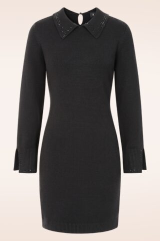 “A little black dress… but louder.” Deze a-lijn jurk is uitgevoerd in een soepele en stretchy, fijngebreide zwarte viscosemix die heerlijk draagt en is voorzien van een puntig kraagje en glimmende, zwarte strass steentjes aan de mouwen en kraag. * A-lijn model * Puntig kraagje * Lange mouwen * Keyhole met knoopsluiting achterzijde * Valt bij een lengte van 1,70 m net boven de knie