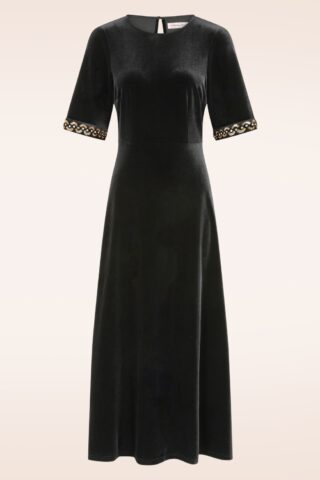 “This dress is a real showstopper!” Ze is uitgevoerd in diepzwart, glanzend fluweel van een zware kwaliteit dat licht stretcht en is afgewerkt met strassteentjes en goudkleurige pailletten en kraaltjes aan de halve mouwtjes. * Maxi jurk * Ronde, hoge halslijn * Wijde 1/2 mouwtjes * Keyhole met knoopsluiting aan de achterzijde * Blinde rits aan de achterzijde * Valt op de enkel bij een lengte van 1,70 m