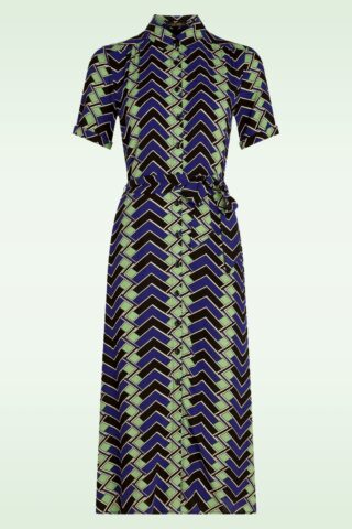 ”Retro vibes, modern feels.” Lola Drift is prachtig om te zien en heeft een revers kraag, korte mouwen en een afneembaar stiklintje om je taille te accentueren. Ze is ook heerlijk om te dragen dankzij de soepele en luchtige EcoVero viscose, met een retro geometrische print in groentinten, welke een milieuvriendelijk alternatief voor regulier viscose is. * A-lijn * Reverskraag * Knopenrij * Korte mouwen * Afneembare strikband voor een extra ‘snatched’ taille * Reikt bij een lengte van 1,70 m tot over de knie