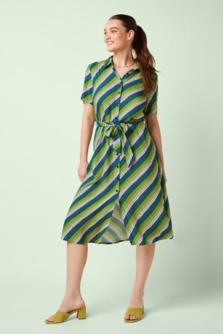 “Stripe it till you like it!” Deze midi doorknoopjurk is speels én vrouwelijk dankzij de top met puntig kraagje, korte mouwen en het afneembare striklint dat je taille prachtig accentueert. Ze is uitgevoerd in een heerlijk soepele EcoVero viscosemix (stretcht niet) met een frisse gestreepte print in groen, crème en blauwtinten. * Midi model * Doorknoopjurk * Puntig kraagje * Korte mouwen * Afneembare strikband voor een extra ‘snatched’ taille * It has pockets! * Reikt bij een lengte van 1,70 m tot op de kuit