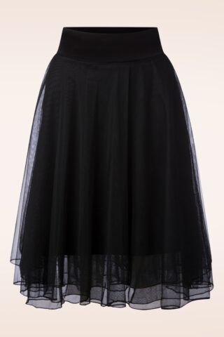 ”It would be ‘sheer’ madness not to love this 50s Mendy Mesh Layer Skirt in Black!” Deze prachtige swing rok draag je hoger in de taille, is bedekt met twee doorzichtige lagen mesh en is voorzien van een onderrok met een petticoat detail aan de onderzijde voor wat extra body. Uitgevoerd in een soepel vallend, stretchy, zwart stofje dat heerlijk draagt en met je meebeweegt bij iedere stap die je zet. ”Always believe in the magic of a mesh skirt!” * Swing model * Elastische tailleband * 2 lagen tule * Onderrok met petticoat detail * Geen rits of knopen * Valt over de knie bij een lengte van 1,70 m