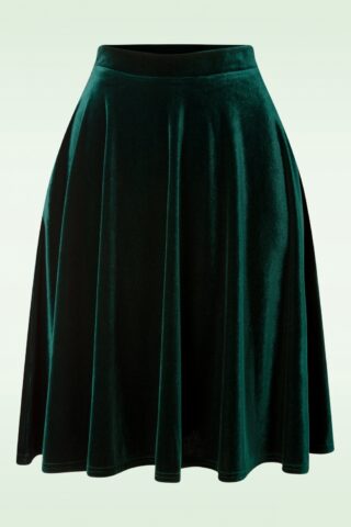 Feestdagen of gewoon een dagje full glamour? Deze 50s Sheila Swing Rok in Groen Fluweel is jouw sidekick! Deze beauty wordt hoog in de taille gedragen en waaiert prachtig uit waardoor je een super vrouwelijk zandloper figuur krijgt, oh la la. Uitgevoerd in een soepel vallende, stretchy, donkergroene fluwelen stof die elegant glanst zodra er licht op valt. Niets is zo charmant als een vrouw in glanzend fluweel… * Full swing * Zijwaartse steekzakken * Geen rits of knopen * Elastische taille * Valt op de knie bij een lengte van 1,70 m