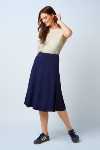 “Simply blue-tiful.” Deze midi rok is een echte allrounder die moeiteloos meegaat in elke look. Ze heeft een comfortabele elastische tailleband en zwiert soepel met je mee bij iedere stap. Ze is uitgevoerd in een soepele en luchtige EcoVero viscosemix en het effen beacon blauwe design maakt haar eindeloos combineerbaar! * A-lijn * Elastische tailleband * Geen rits of knopen; aantrekken en ‘ready to go’! * Valt bij een lengte van 1,70 m over de knie