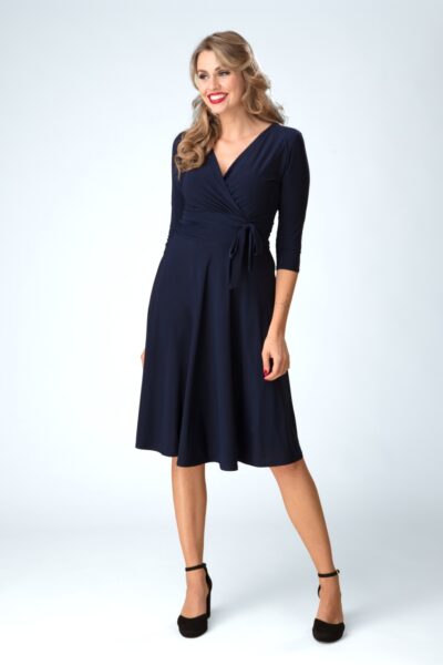 Voel je op en top vrouw in deze Aria swing jurk! Ze is uitgevoerd in een soepele en stretchy, licht glanzende, slinky stof in marineblauw en is tevens licht van gewicht en kreukt niet. * Semi-swing model * V-halslijn * Vaste gevoerde overslag * 3/4 mouwen * Geplooide tailleband met vaste strik * Geen rits of knopen; aantrekken en ready to go! * Valt over de knie bij een lengte van 1,70 m * Melissa is 1,78 m * Let op; de kleur van het product op video kan afwijken van de daadwerkelijke kleur van het product