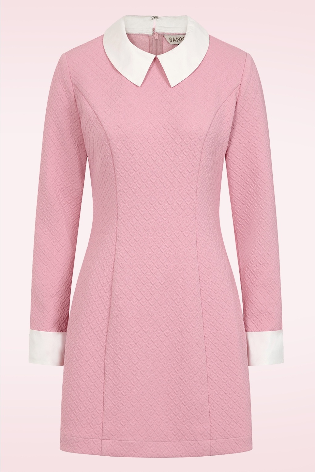 “Mod simplicity, bubblegum chic.” Deze sixties stijl a-lijn jurk is uitgevoerd in een zachte, stretchy lichtroze structuurstof met een puntig wit kraagje en witte manchetten aan de lange mouwen.    * A-lijn model * Puntig kraagje * Lange mouwen met manchetten * Ritssluiting achterkant * Valt op de knie bij een lengte van 1,70 m