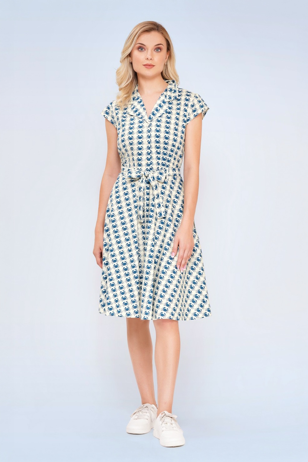 “Serving looks, not claws.” Deze retro beauty heeft een revers kraagje met korte kapmouwtjes, een afneembaar striklint en is voorzien van handige steekzakjes. Ze is uitgevoerd in een stevige maar soepel vallende katoen in crème, die heerlijk draagt en voorzien is van blauwe krabbetjes all-over. * Semi-swing jurk * Revers kraag * Kapmouwtjes * Reeks functionele knopen * Blinde rits aan de zijkant * It has pockets! * Afneembaar striklint, voor een extra ‘snatched’ taille * Reikt bij een lengte van 1,70 m tot net boven de knie