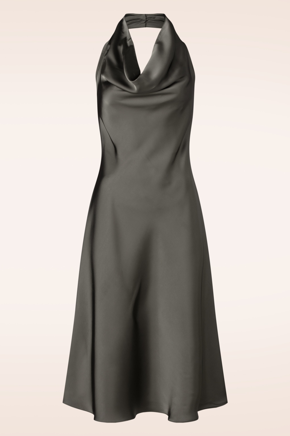 “As smooth as chocolate, as timeless as satin!” Deze midi halter jurk heeft een subtiele waterval hals en is uitgevoerd in een non-stretchy bruingrijze stof met de look and feel van luxe satijn, die heerlijk draagt!    * Midi jurk * Halterstijl * Waterval hals * Rugpand met elastiek * Geen rits of knopen * Valt net op de kuit bij een lengte van 1,70 m