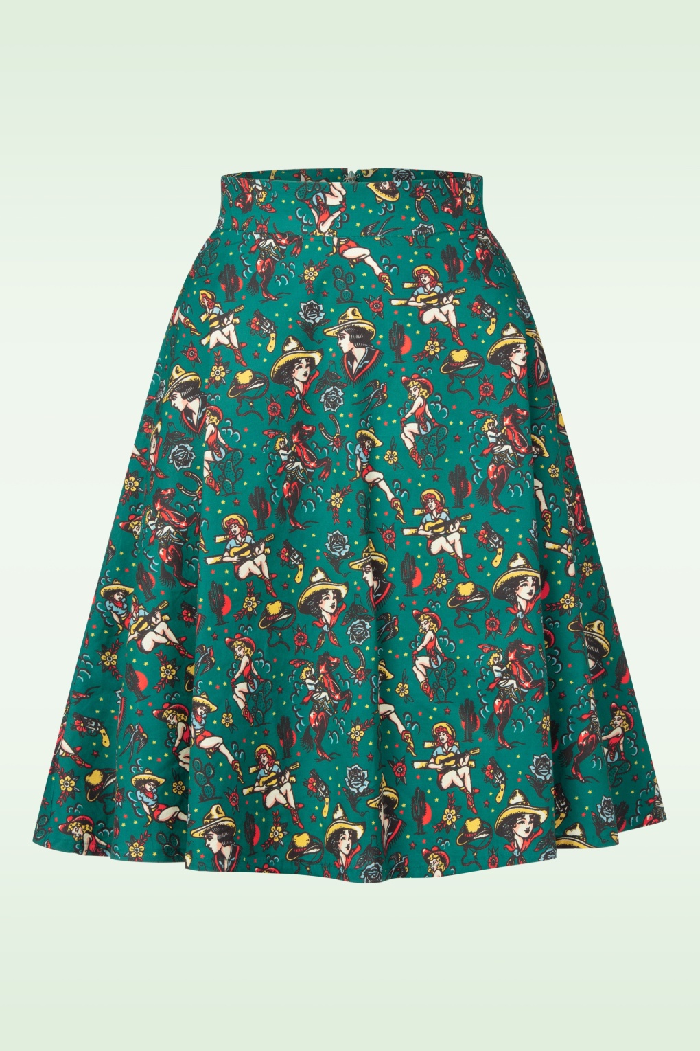 “Wild West with a rockabilly twist!” Deze donkergroene swingrok is alles wat je zoekt: vrouwelijk, speels én stoer. Ze heeft een flatterende hoge taille, handige zakken (yes, zakken!) en zwiert prachtig met je mee bij elke stap. De print met cowgirls geeft haar een unieke retro vibe die perfect past bij een rockabilly look. Uitgevoerd in een stevige maar soepele katoenmix met een vleugje stretch voor extra draagcomfort. * Swing model * Voorzien van zakken * Valt bij een lengte van 1,70 m op de knie