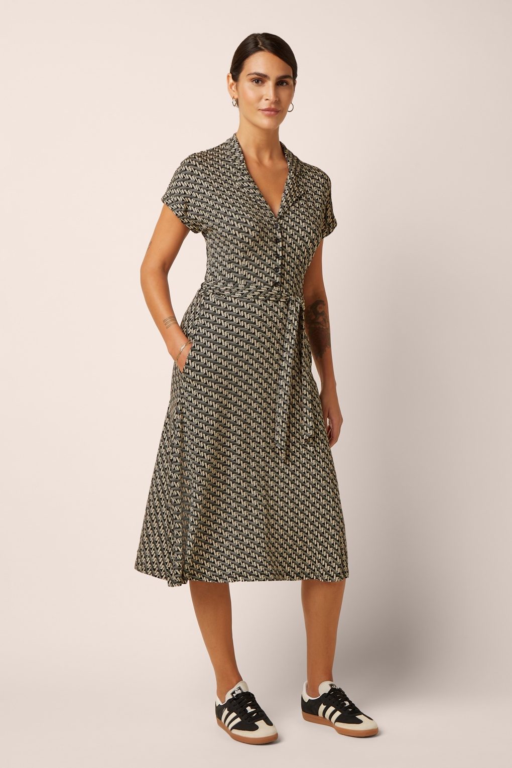 ”Speels, vrouwelijk en helemaal retro!” Ze is uitgevoerd in een heerlijk soepele en luchtige EcoVero viscosemix (stretcht niet!) met een prachtige geometrische retroprint in crème en zwart, die garant staat voor eindeloos draagplezier. What’s not to love? * Midi jurk * Revers kraagje * Reeks knopen * Korte kapmouwen met omslagjes * Afneembare strikriem * It has pockets! * Valt bij een lengte van 1,70 m over de knie