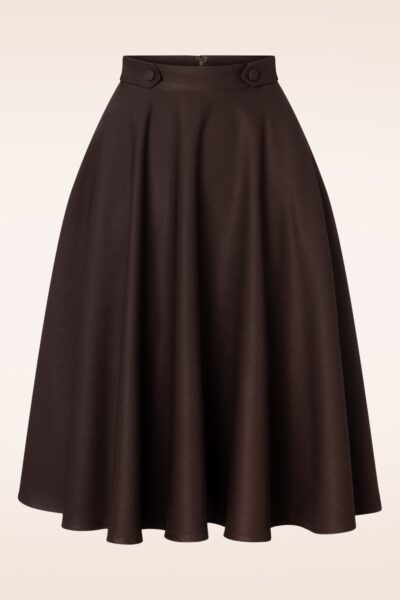 ”Swing your way into winter” met deze Di Di Swing Skirt in Brown! Dit fifties pareltje draag je hoog in de taille, vanwaar zij uitloopt in een klassieke, elegante swing rok. De ‘faux’ knoopdetails in de zij vormen niet alleen een speels detail, maar benadrukken je taille ook nog eens extra. Uitgevoerd in een stevige maar soepel vallende, donkerbruine stof (stretcht amper) die prachtig met je mee beweegt. De winterperiode kan zo mooi zijn, zeker met een rok als Di Di in je kast! 😉 * Full swing rok * ‘Faux’ knoopdetails * Zijwaartse steekzakken * Rits- en haaksluiting achterzijde * Combineer met een van onze petticoats voor een extra feestelijk effect * Valt bij een lengte van 1,70 m over de knie