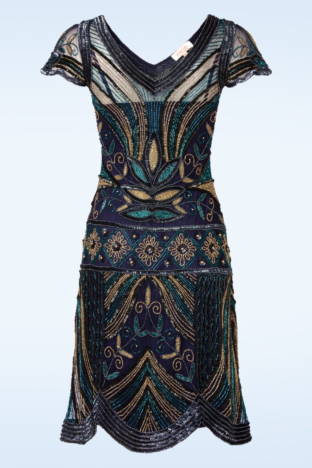 “Roaring ’20s vibes, modern sparkle… flapper fabulous in every step.” Deze hand bewerkte, party-proof jurk is een reproductie van de elegante flapper dresses uit de jaren 20! Uitgevoerd in een donkerblauwe, semi-doorschijnende stof met een donkerblauwe onderjurk, voorzien van een hele lichte stretch. Afgewerkt met glimmende kraaltjes, pailetten en studs in blauw, zwart en goudtinten. “Dazzle, sparkle, repeat!” * Aansluitend model * Handbewerkt * Onderjurkje * V-hals en rug * Geschulpte kapmouwtjes * Geen rits of knopen; aantrekken en ready to party! * Valt bij een lengte van 1,70 m net over de knie