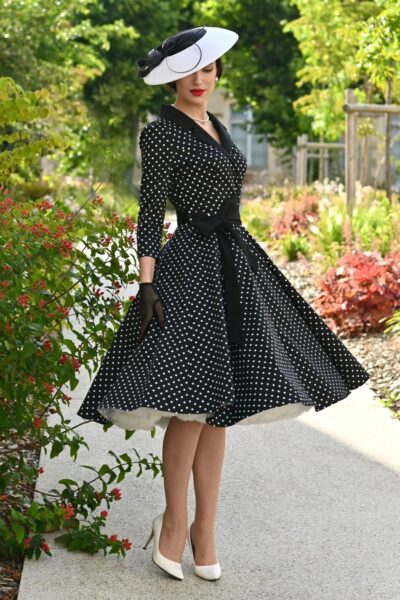 “Spot on with timeless style!” Deze zwarte swing jurk met witte polkadots is pure retro-chic! Ze heeft een vaste overslag met een elegante V-hals en reverskraag, flatterende 3/4 mouwen en een afneembaar striklint in de taille dat je silhouet prachtig benadrukt. Gemaakt van een soepele en comfortabele katoenmix met een lichte stretch, waardoor ze heerlijk draagt en je look een speelse fifties flair krijgt. * Swing jurk * Revers kraag * Vaste overslag * 3/4 pofmouwen * Voorzien van zakken! * Afneembaar striklint, voor een extra ‘snatched’ taille * Blinde ritssluiting aan de zijkant * Te combineren met een petticoat voor een extra feestelijk effect * Valt bij een lengte van 1,70 m over de knie * Let op; de kleur van het product op de video kan afwijken van de daadwerkelijke kleur van het product * De pumps en accessoires die in de video worden getoond zijn niet verkrijgbaar in onze shop