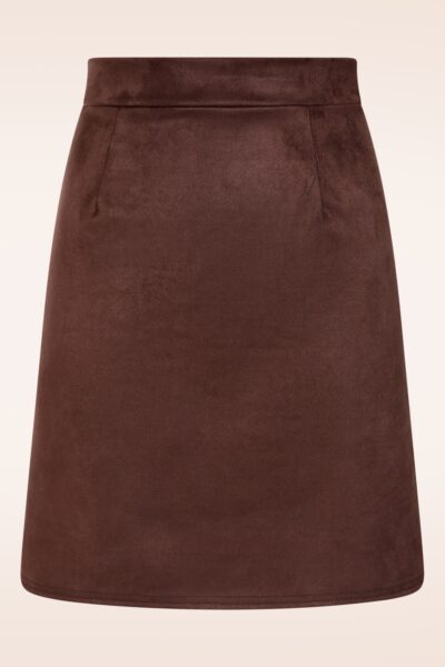 ”Be a go getter in faux leather!” Edith wordt hoog in de taille gedragen vanwaar ze uitloopt in een speels A-lijntje. Uitgevoerd in soepel en zacht, chocoladebruin imitatie suède met een fijne stretch. * A-lijn * Blinde rits achterzijde * Valt bij een lengte van 1,70 m boven de knie