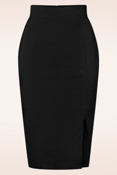 De 50s Eleonora Pencil Skirt in Black is een klassieke veelzijdige rok! Deze rok wordt hoog in de taille gedragen en is uitgevoerd in een stretchy, zwarte bengaline stof die je rondingen perfect benadrukt. Eindeloos combineren verzekerd met deze tijdloze topper! * Aansluitend hoog taille model * Split zijkant * Blinde rits achterzijde * Valt bij een lengte van 1,70 m over de knie